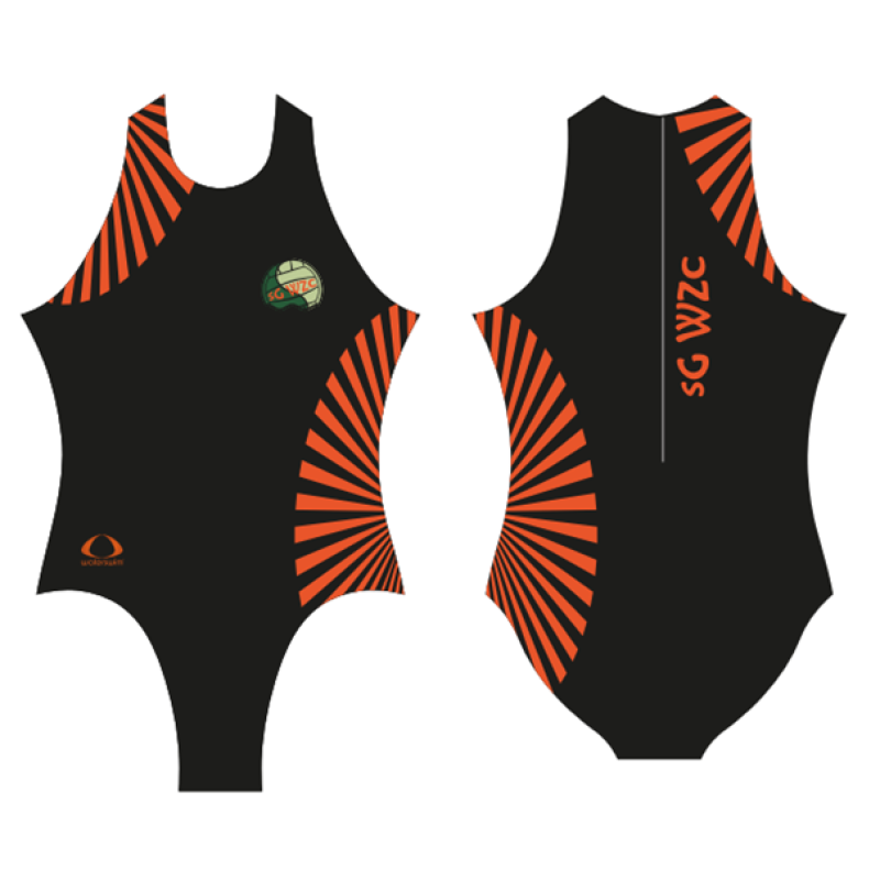 Het Waterswim vereniging waterpolobadpak is speciaal ontwikkelt voor de professionele waterpolo speelster. Dit waterpolobadpak wordt speciaal in de kleuren en in de huisstijl van SG-WZC geproduceerd. Het Waterswim Waterpolobadpak wordt gemaakt van hoogwaardig chloorbestendige stof uit Italië. Dit model is dubbel laags met identieke voeringsstof als buitenzijde, waardoor het badpak zich extra strak vormt om je lichaam en uitscheuren nagenoeg onmogelijk is. A-MERK / YKK kunststof rits met extra stof aan de binnenzijde ter voorkoming van irritatie en wrijving op de rug en in de nek. Aan de zijkant is dit badpak niet te hoog gesneden, waardoor ideale pasvorm voor de meeste dames.